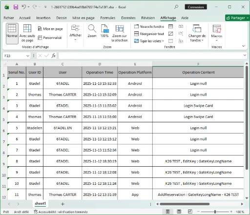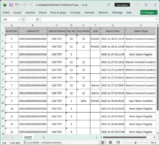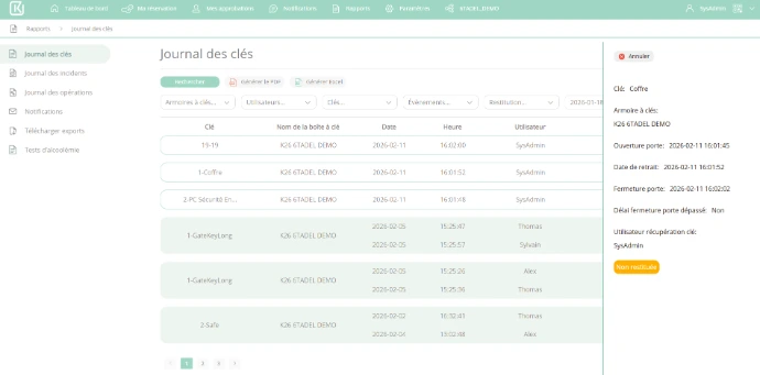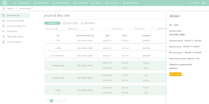 Génération de rapports par utilisateur, par clé, par site ou par période, avec possibilité d’export vers vos outils de reporting ou de conformité (Excel, PDF).