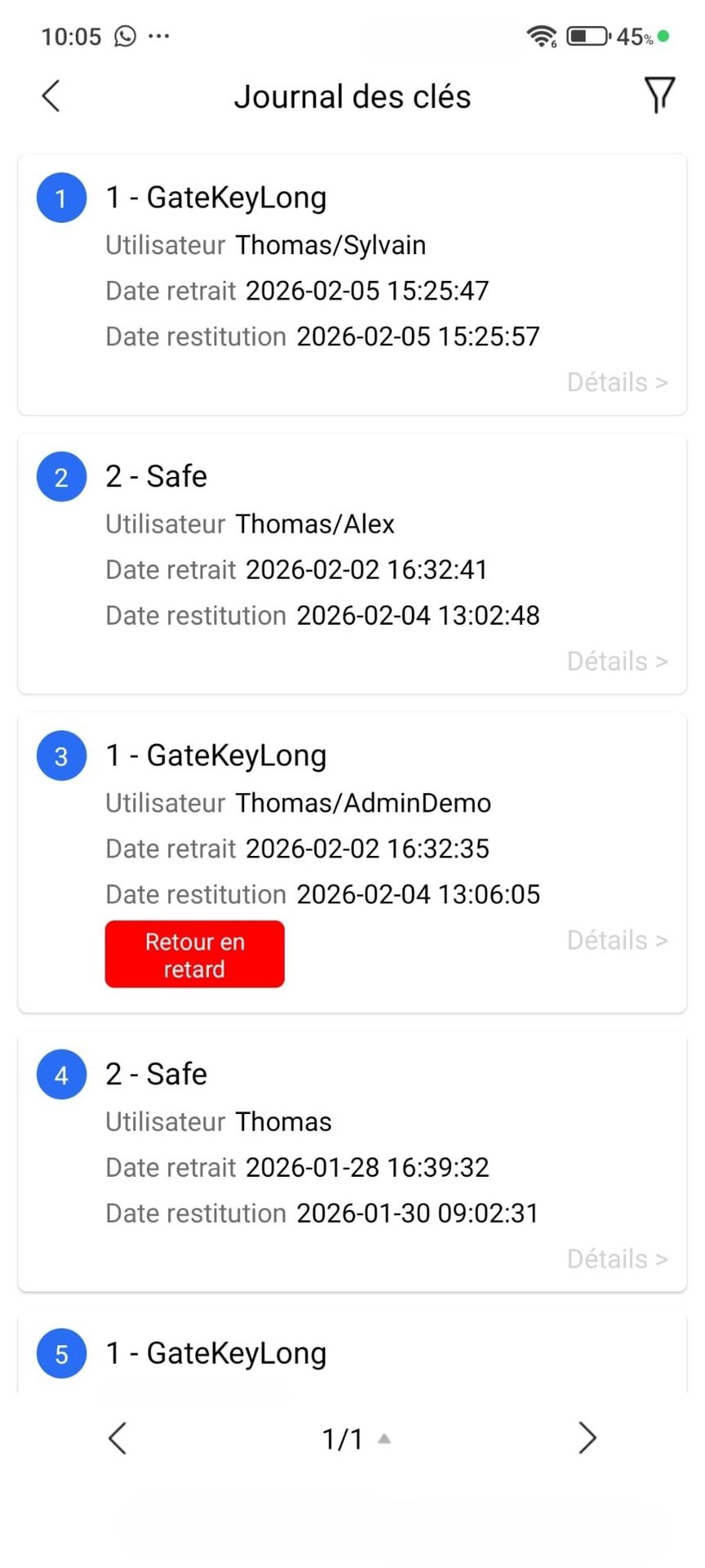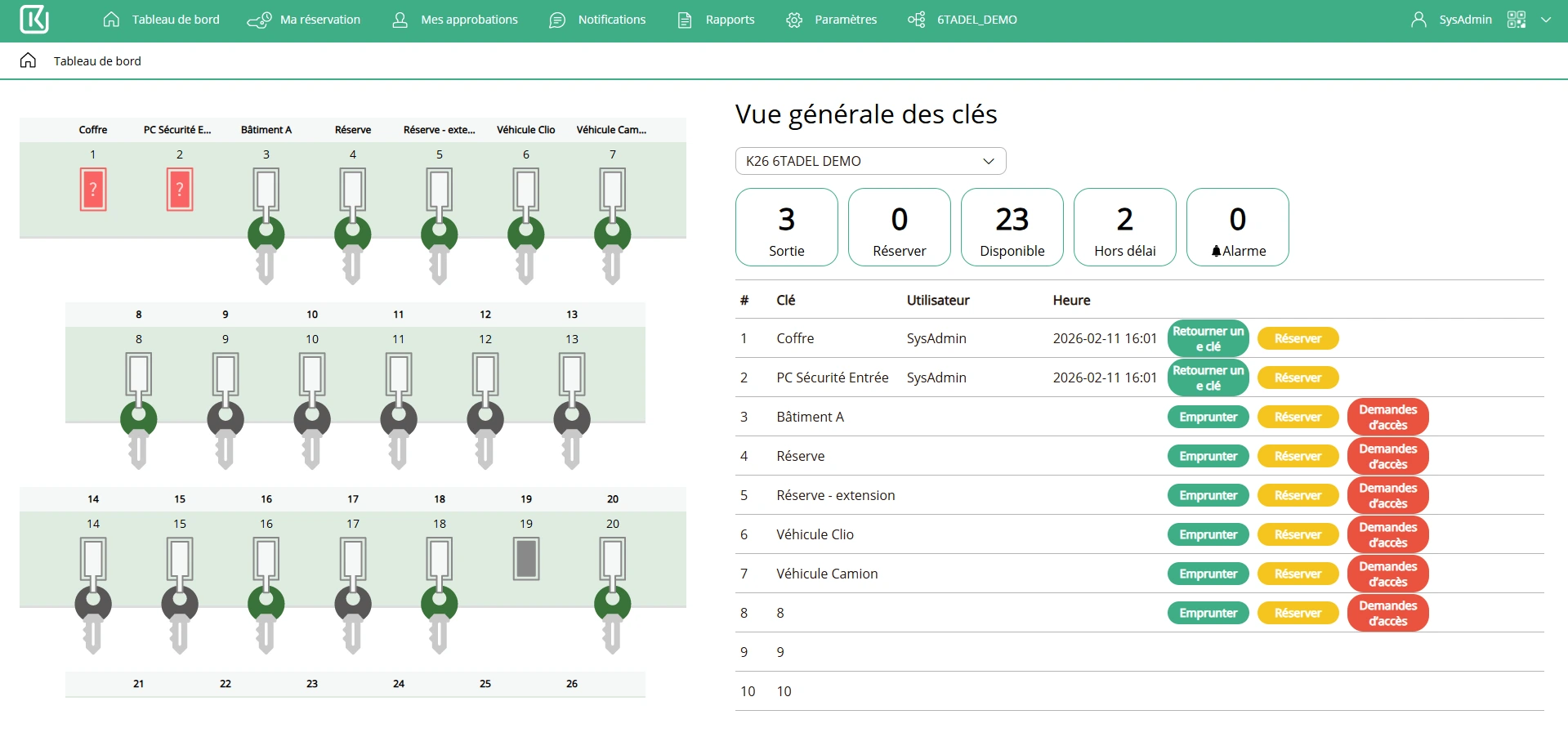 Visibilité totale et instantanée sur chaque mouvement de clé, incidents et connexion connexions, emprunts, retours, alertes…